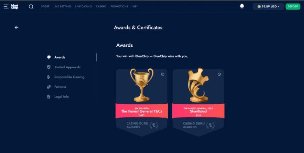 Apparently, Bluechip casino was shortlisted for “The Fairest General T&Cs” in the 2023 Casino Guru Awards – something the casino is so proud of, it had to post the same thing twice.