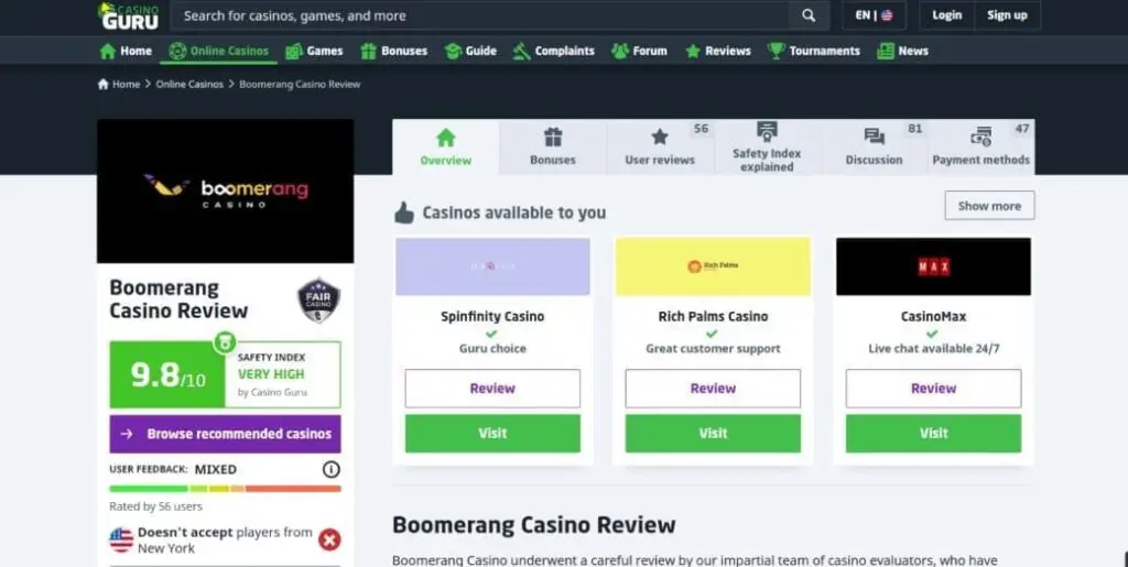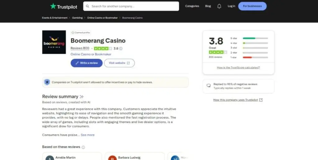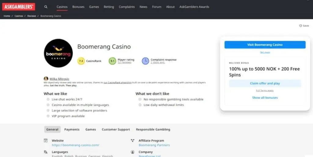 Right, so now we’ve seen what Boomerang crypto casino offers in terms of product and features, let’s check out its reputation. As always, keep in mind that Trustpilot is flooded with fake reviews and Casino Guru and AskGamblers may be useful, but they are still highly biased affiliate marketers (unlike CoinBets). Here were the ratings at the time of writing this Boomerang-Casino.com review: