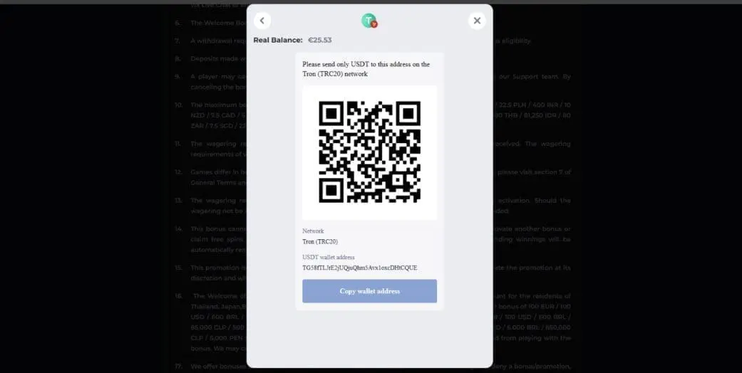 To make a crypto deposit, tap the yellow “Cashier” tab, then select your desired payment method (tap “Show all” and scroll down for the cryptos). Enter the amount you want to deposit, then tap “Deposit.” You’ll be provided with a unique deposit address in both QR code and text formats.