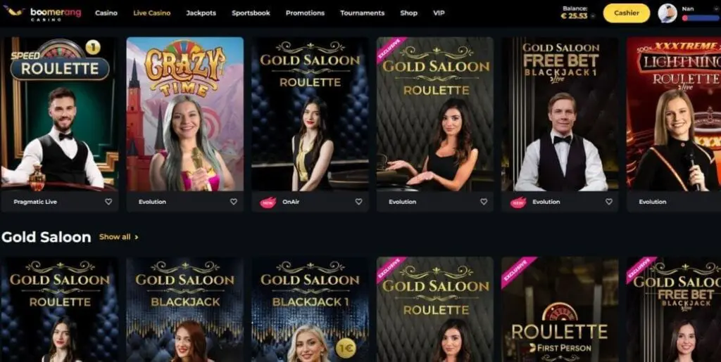Fortunately, the Boomerang live casino is a little easier to browse. From the main lobby, you’ll find categories for live dealer blackjack and live roulette, baccarat and dice, and poker. Unsurprisingly, the line-up is dominated by the usual duo of Evolution and Pragmatic Play Live, but you’ll also see OnAir, Skywind, Creedroomz Live, Ezugi, and Bombay Live.