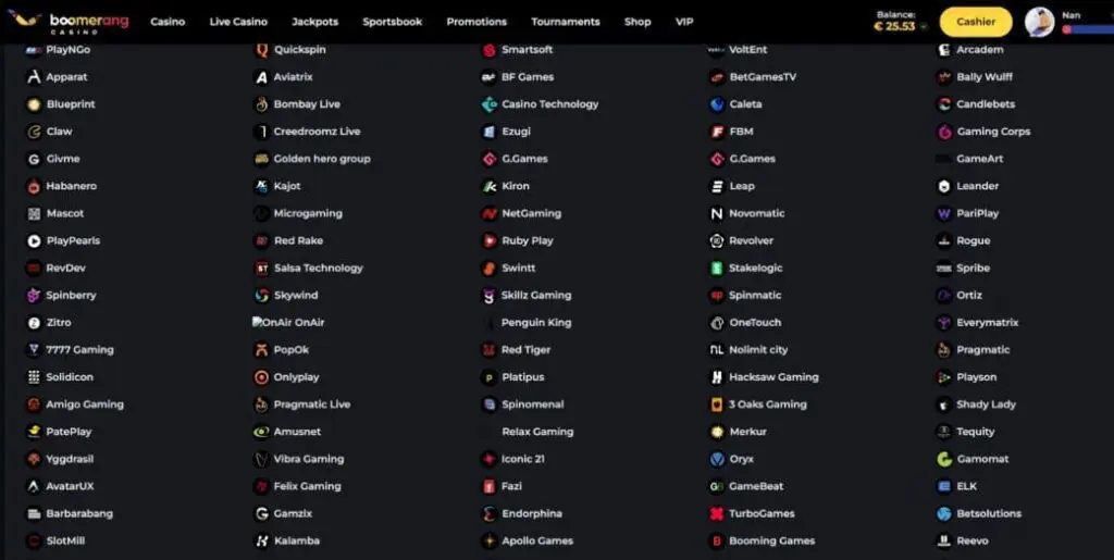 Despite most affiliate review sites saying BoomerangCasino offers around 3,000 games from around 80 providers. However, it’s not a well organized casino, with a very poorly designed navigation and filters, so counting is extremely difficult.