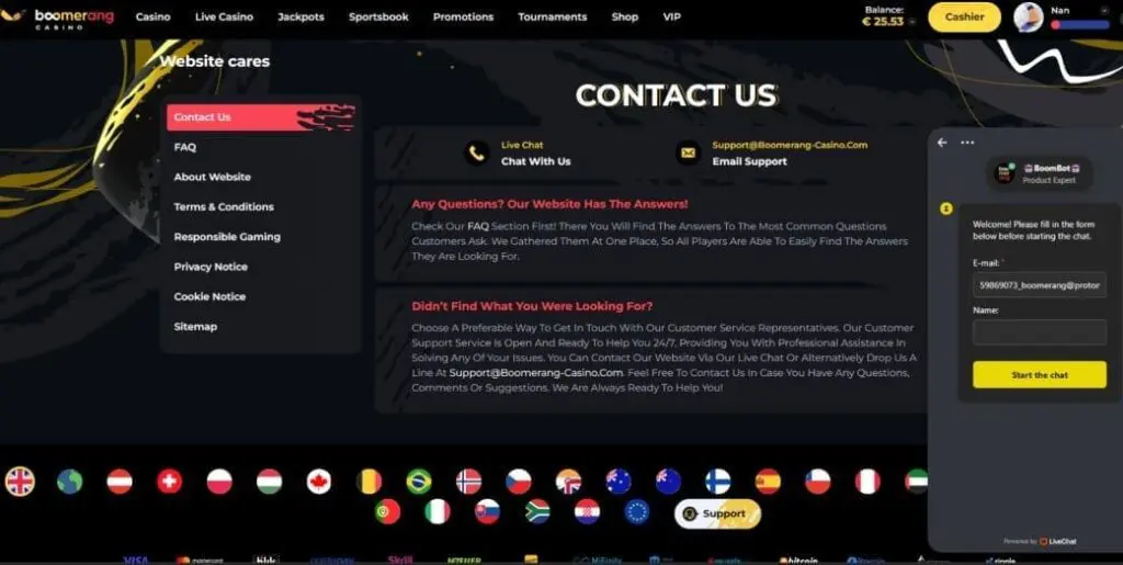 Boomerang Casino offers 24/7 live chat support – although this is, initially at least, provided by a bot. However, you can email the support team on support@boomerang-casino.com.