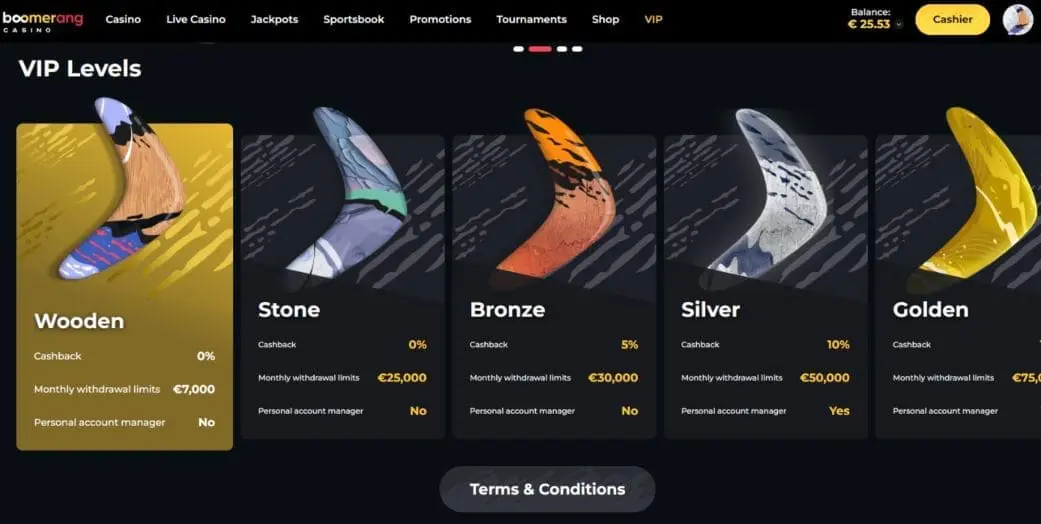 The Boomerang Casino VIP program features just 5 levels – making it refreshingly simple for today’s crypto casinos. However, as is so often the case, specific details are thin on the ground. For example, no information is provided about how you progress through the tiers. But hey, who needs to know minor details like that?