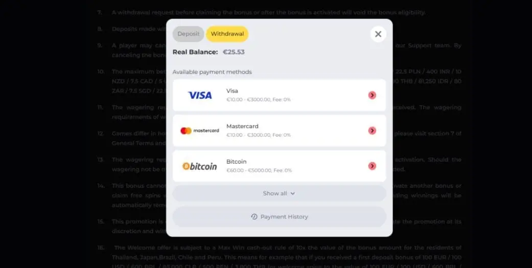 BoomerangCasino also supports fiat options Visa, Mastercard, paysafecard, Revolut, Internet Banking, Rapid Transfer, Skrill, Skrill 1-Tap, Neteller, CashtoCode, Jetonbank, and MiFinity.