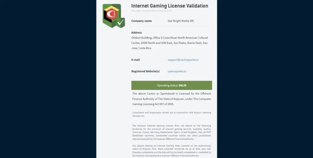 Punkz is operated by Star Bright Media SRL, which is registered in Costa Rica (company no.3-102-880000), and is licensed by the Anjouan Gaming Board (license no. ALSI-202408063-FB).