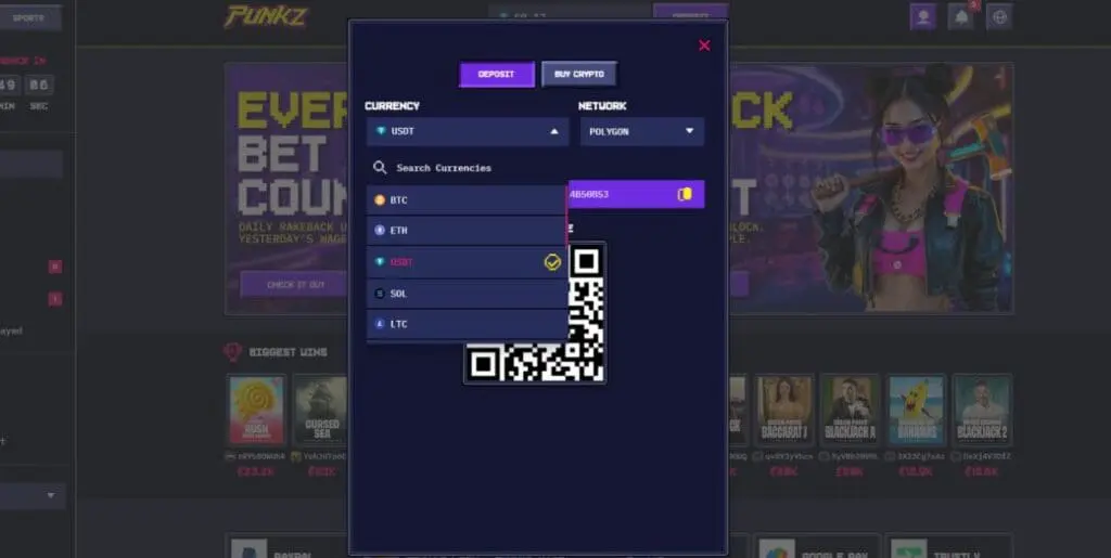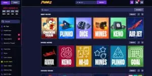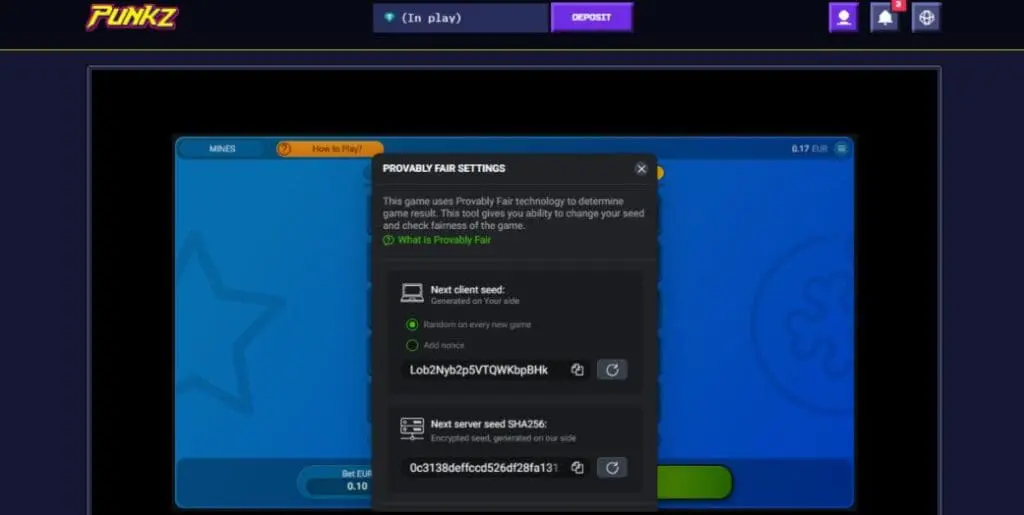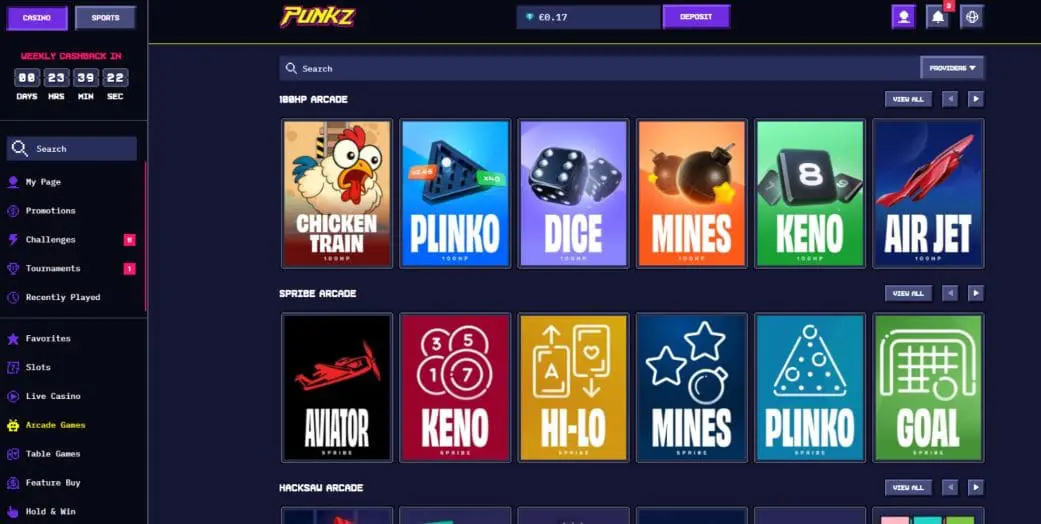There aren’t any in-house original provably fair games at Punkz, but there are a few from third-party providers. You’ll find them in the previously mentioned “Arcade” section. Options include Keno, Hi-Lo, and Mines from Spribe, and Dice, Chicken Train, and Plinko from 100HP.