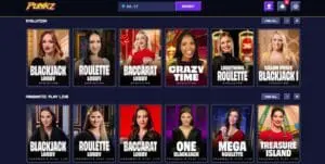 Live game shows get their own category at Punkz – you’ll find all the usual hits like Cash Wheel Carnival, Snakes & Ladders, Crazy Time, Lightning Storm, and Monopoly.