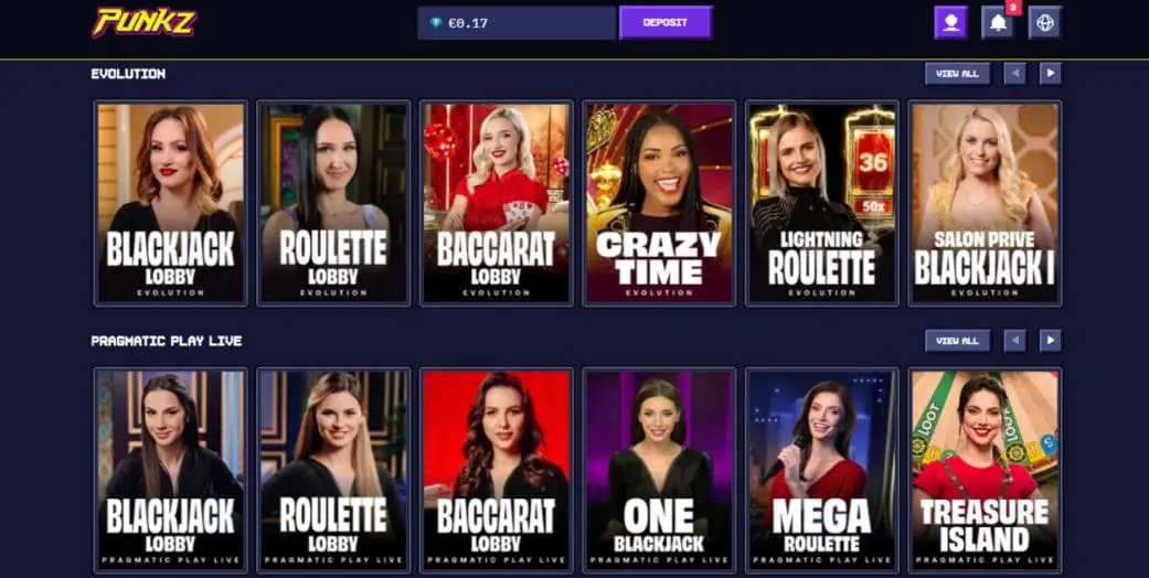 The Punkz live casino features games from Evolution, Pragmatic Play, Live88, Microgaming Live, Creedroomz, Winfinity, and Animo Live. If you open up the individual provider/game type lobbies, you’ll find hundreds of variants of blackjack, roulette, baccarat, and dice games.
