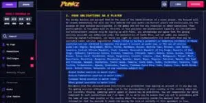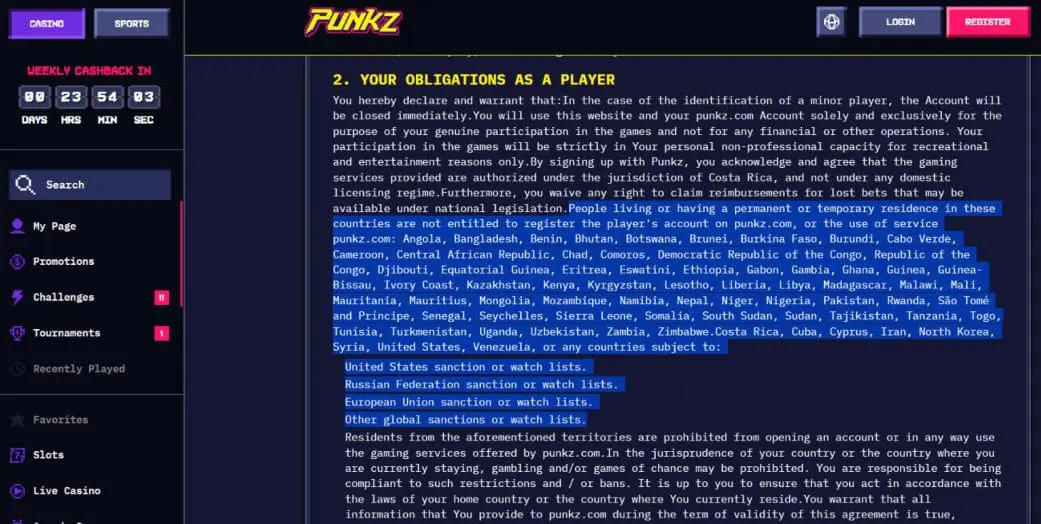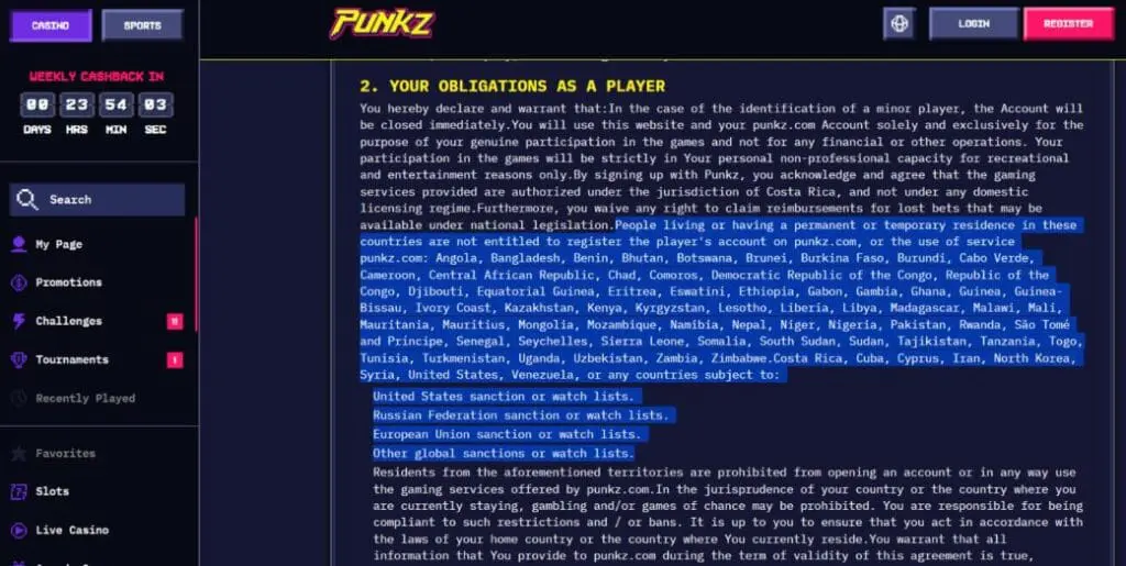 Despite bestowing its “KYC-free” and “VPN-friendly” virtues on players, the CasinoPunkz terms and conditions actually prohibit players from most jurisdictions. First up, there’s a list of specifically prohibited countries and territories, which includes the United States, and then it excludes any countries subject to: United States sanctions or watch lists, Russian Federation sanctions or watch lists, European Union sanctions or watch lists, or any other global sanctions or watch lists.