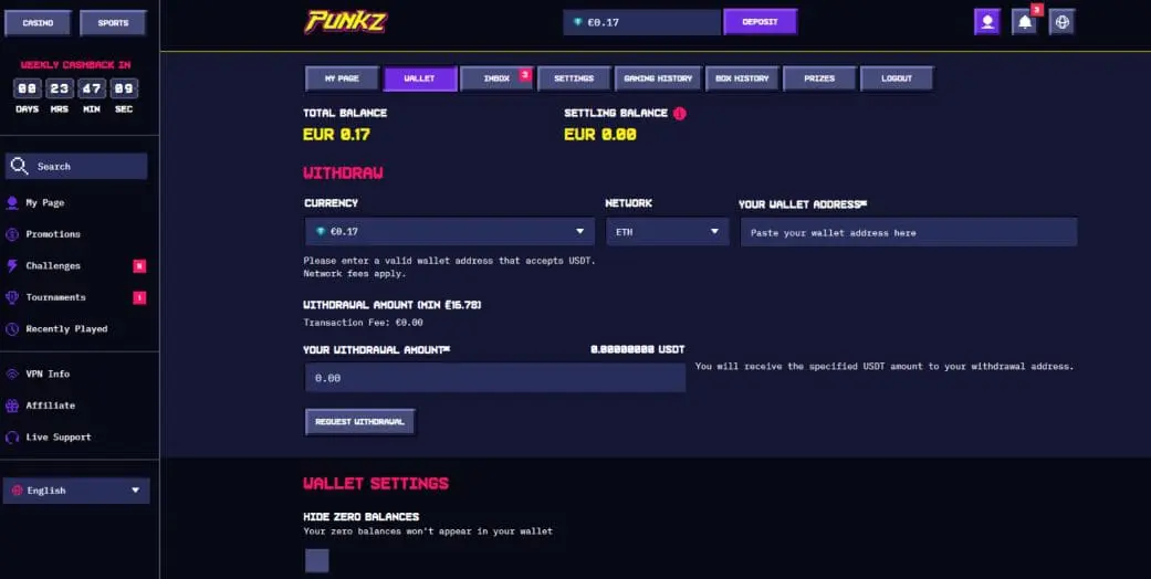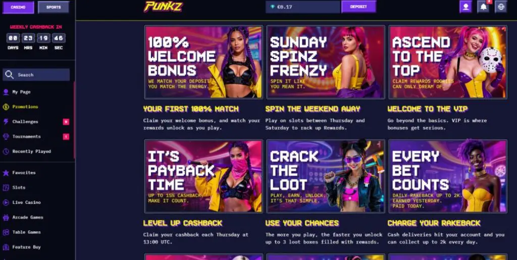 At the time of writing this CasinoPunkz review, the platform was a pure casino – no sports or esports betting available.