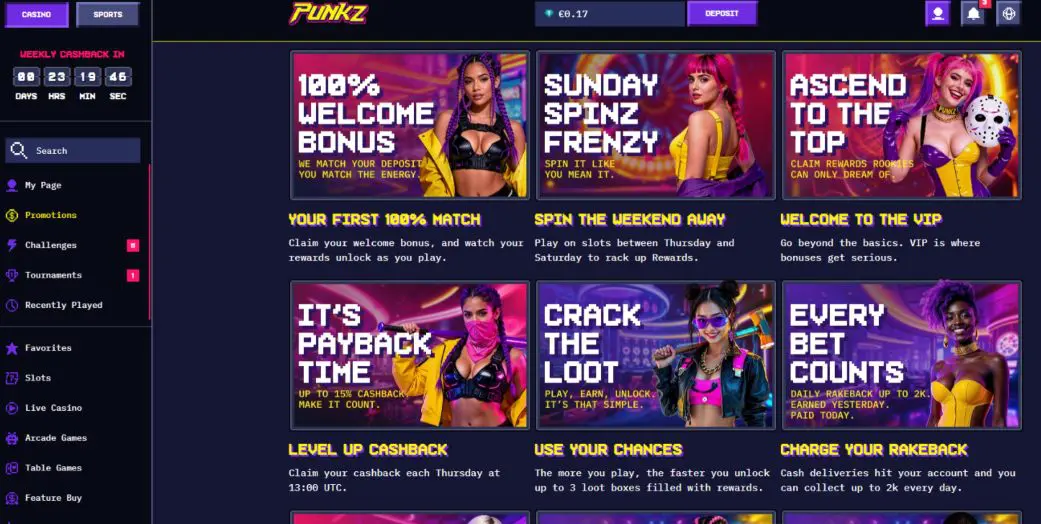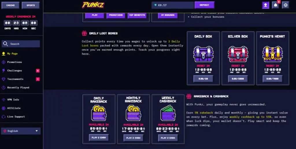 The Punkz VIP program is a relatively simple 6-tier affair, offering rewards like weekly cashback, daily loot boxes, and other bonuses. Your rank is based on XP earned over the preceding 6 weeks. You earn XP for betting real dollars, although the rate isn’t made clear.