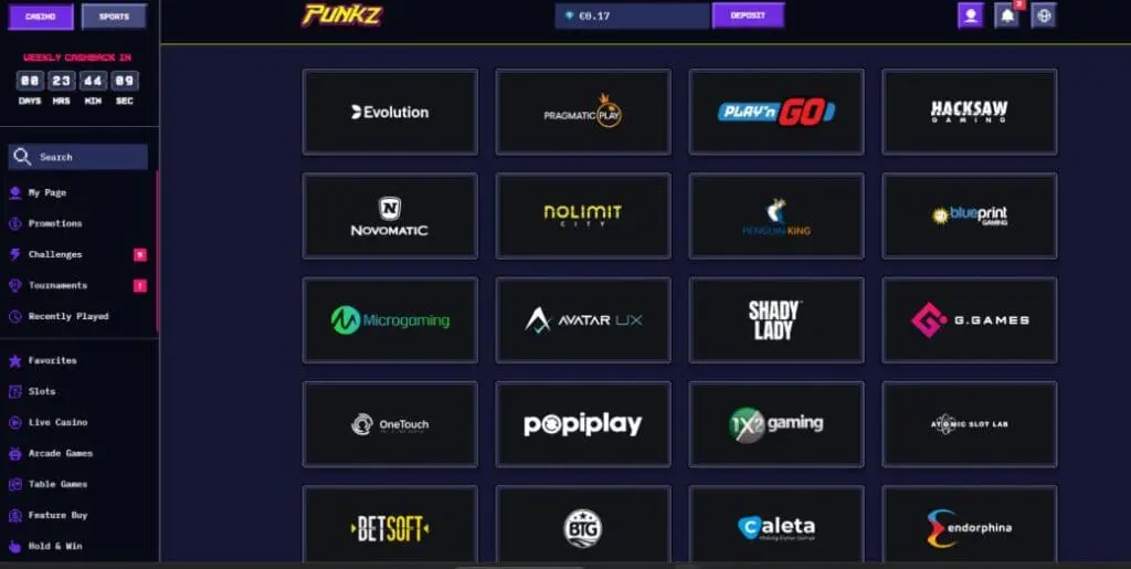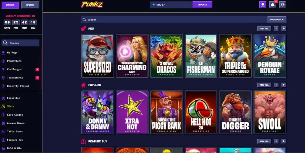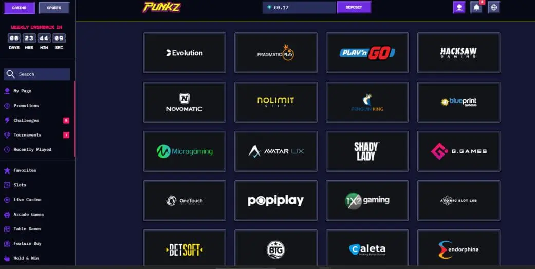 At the time of writing this Casinopunkz review, the platform offered over 5,000 casino games of all types, from 50+ providers. Though the lobbies are neatly laid out, categories are very limited, which makes browsing quite clunky.