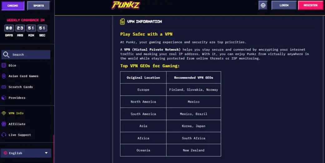 Punkz doesn’t really have much going on in the casino promo department. In fact, besides the welcome bonus and VIP program, there was only a single promotional offer and one tournament: