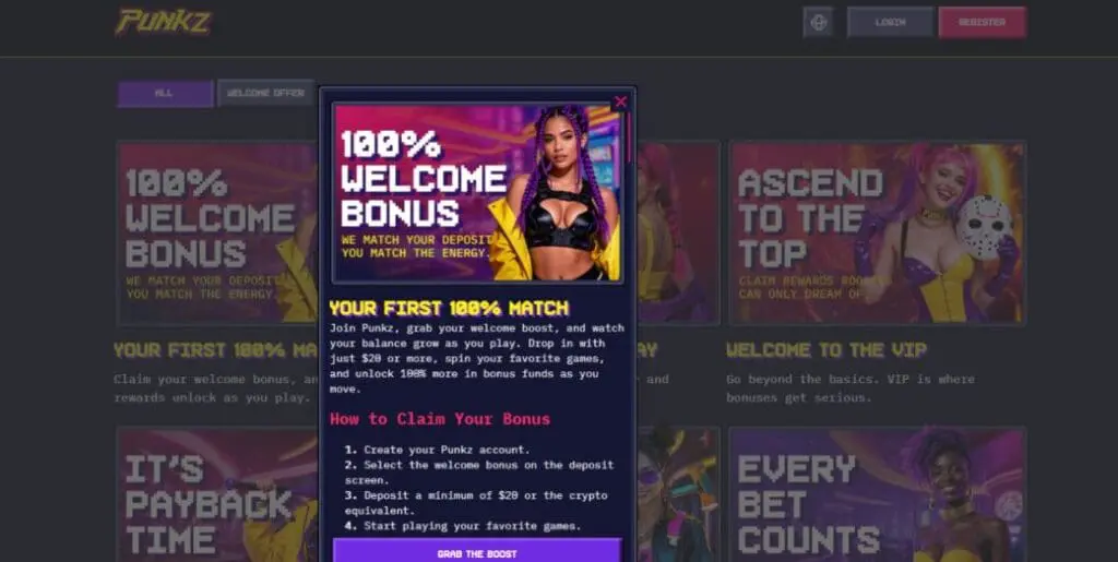 At the time of writing this Punkz review, the casino offered a 100% deposit match welcome bonus, potentially worth up to US$20,000. Sounds generous, right? Well, let’s take a look under the hood: