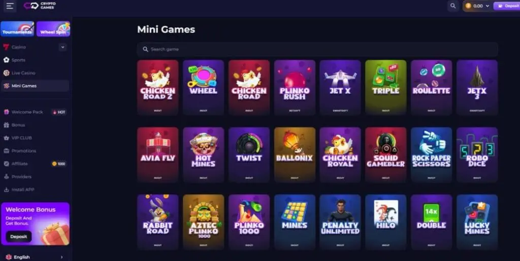You’ll find crash games and other instant wins under the “Mini Games” category here at Crypto-Games. Specific games available include Avia Fly and Chicken Road 2 from InOut, Jet X from Smartsoft, and Plinko from BetSolutions.