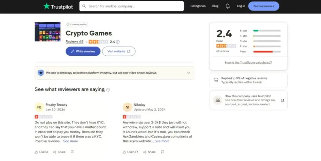 Okay, so that’s what Crypto Games casino offers in terms of product, but what do players think of it? Well, as always, it’s important to appreciate that most reviews are from affiliates so can’t be trusted, and even supposedly unbiased platforms like Trustpilot are now swamped with fake reviews. But to satisfy curiosity if nothing else, here were some ratings at the time of writing: