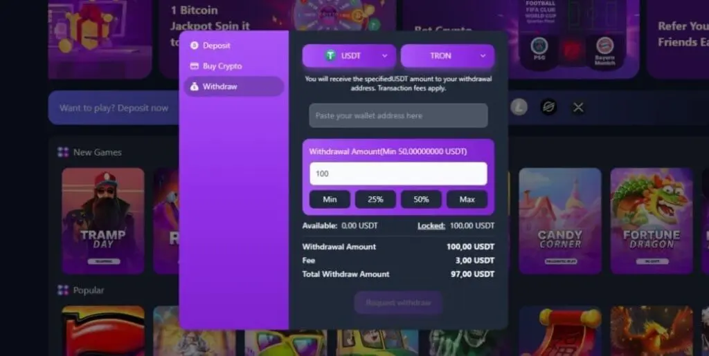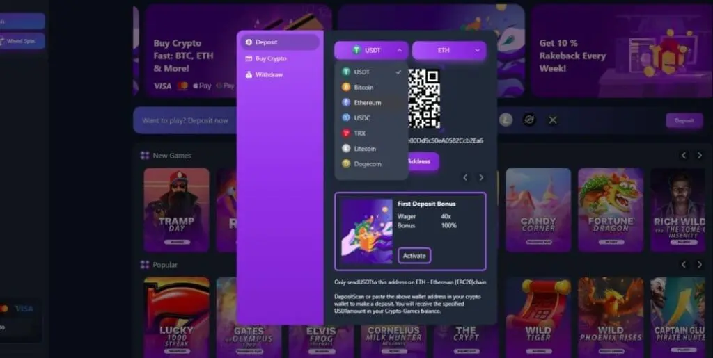 To make a crypto deposit, open your wallet (the purple tab next to your balance), choose “Deposit”, then select the crypto (and network, if applicable) you want to use. You’ll be provided with a unique deposit address in both QR code and text formats. At this point, you’ll also have the option to activate any available bonus.
