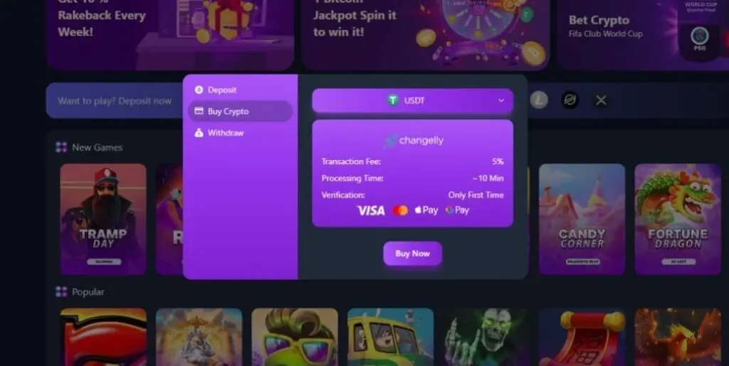 In common with all the best crypto casinos, CryptoGames lets you purchase crypto conveniently via a third-party integration. In this case, it’s via Changelly, which accepts fiat payments including Visa, Mastercard, Apple Pay, and GPay. Simply open your wallet, then click “Buy Crypto.” Select the crypto you want, and then tap “Buy Now.” Follow the prompts to complete your transaction.
