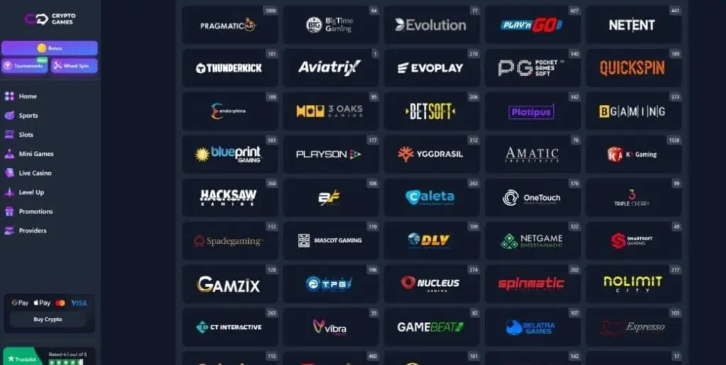At the time of writing, Crypto-Games.io boasted over 4,000 casino games of all types from almost 70 providers. At first glance, the games lobby seemed reasonably well organized, with helpful categories like Bonus Buy, Megaways, Jackpot, etc., but the interface is very clunky and some constantly accessible search filters would be a big improvement.