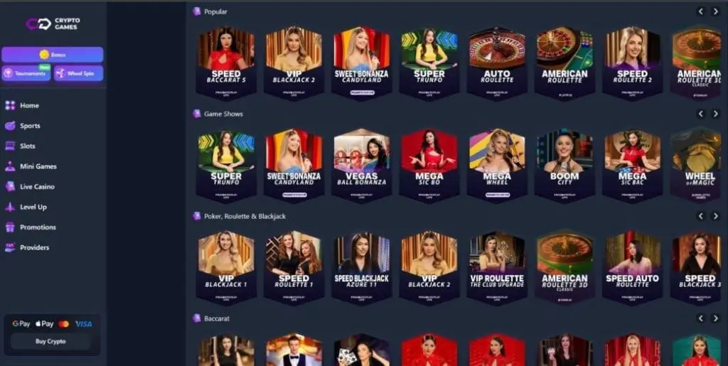 In terms of providers, the live dealer games at CryptoGames are mostly from Pragmatic Play Live and Evolution, although there are also some from Ezugi, Vivo Gaming, and BetGames.