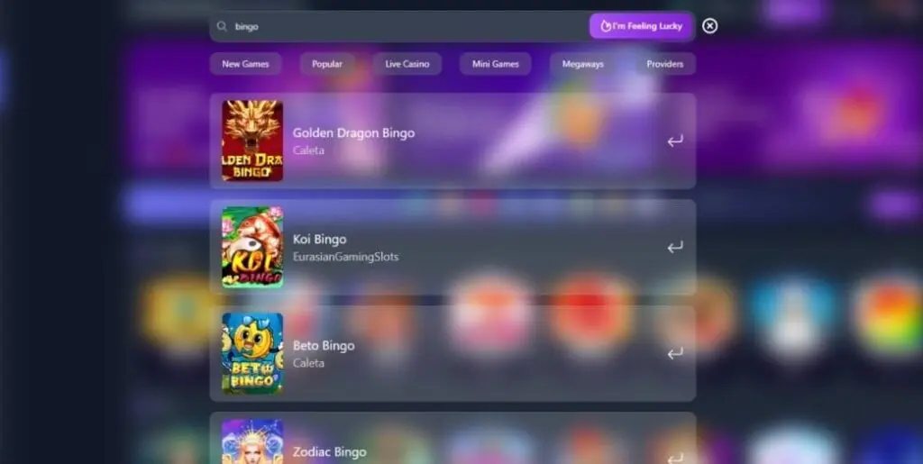 Searching for bingo actually delivers a surprisingly good choice. Specific video bingo games available include Baile Funk Bingo and Grandma Bingo from Caleta, Greek Fortunes: Bingo Bounty from NetGame, and Koi Bingo from Eurasian Gaming Slots. Staying with lottery-style games, a search for keno also serves up a decent choice from providers like Mascot, Caleta, and Jili Games.