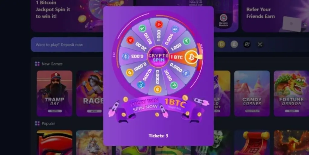 1 Bitcoin Jackpot Wheel – Deposit at last $30 (or equivalent) to get a spin of the wheel, with a chance to “win 1 BTC” with no wagering requirements.