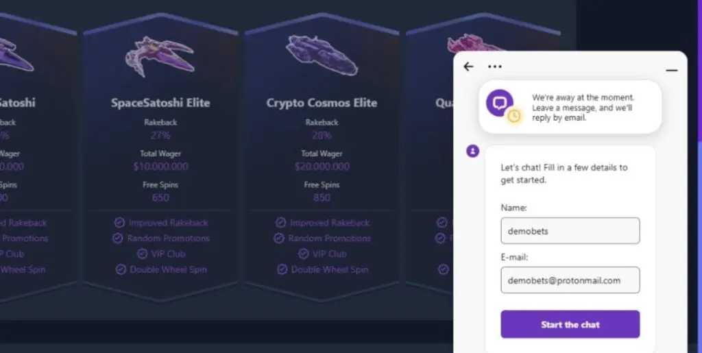Crypto Games casino provides player support via live chat. However, unlike the best crypto casinos, it is not available 24/7 – at the time of writing this review, a message said “We’re away at the moment. Leave a message, and we’ll reply by email.”