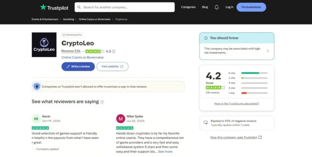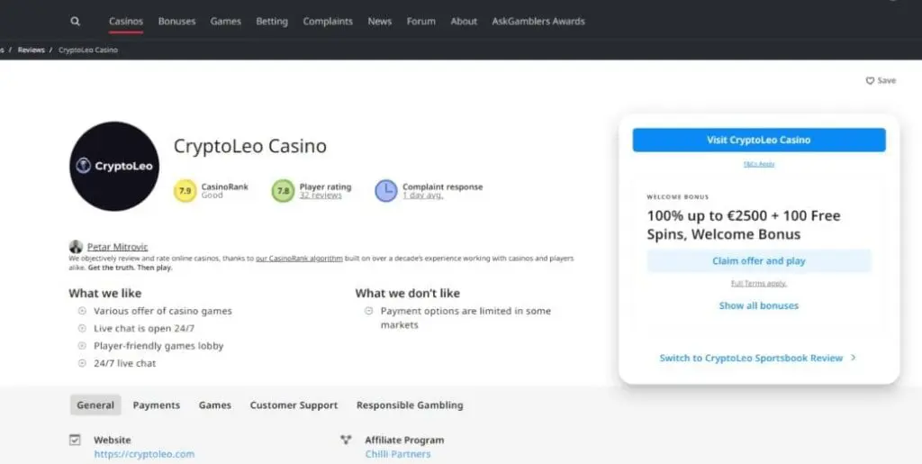 Okay, so now we’re going to see how affiliate reviews can distort the truth. CryptoLeo clearly has some serious red flags. Nevertheless, looking at the reviews on popular platforms, you’d be forgiven for thinking it was one of the best crypto casinos around: