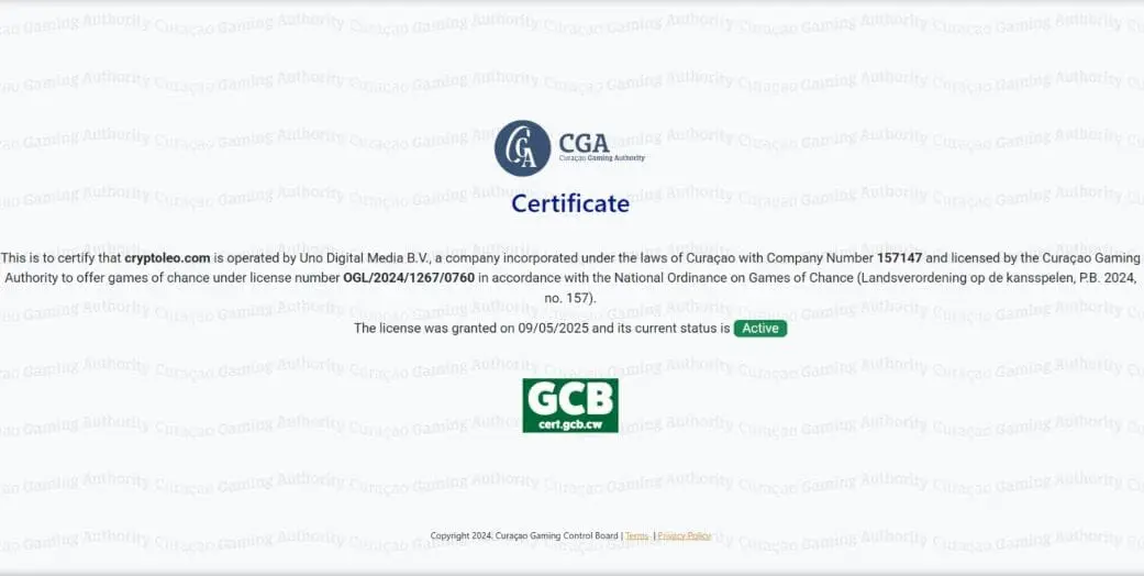 CryptoLeo is operated by Uno Digital Media B.V., a company incorporated in Curaçao (company no. 157147). It is licensed by the Curaçao Gaming Authority (OGL/2024/1267/0760).