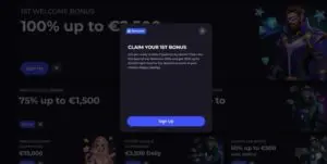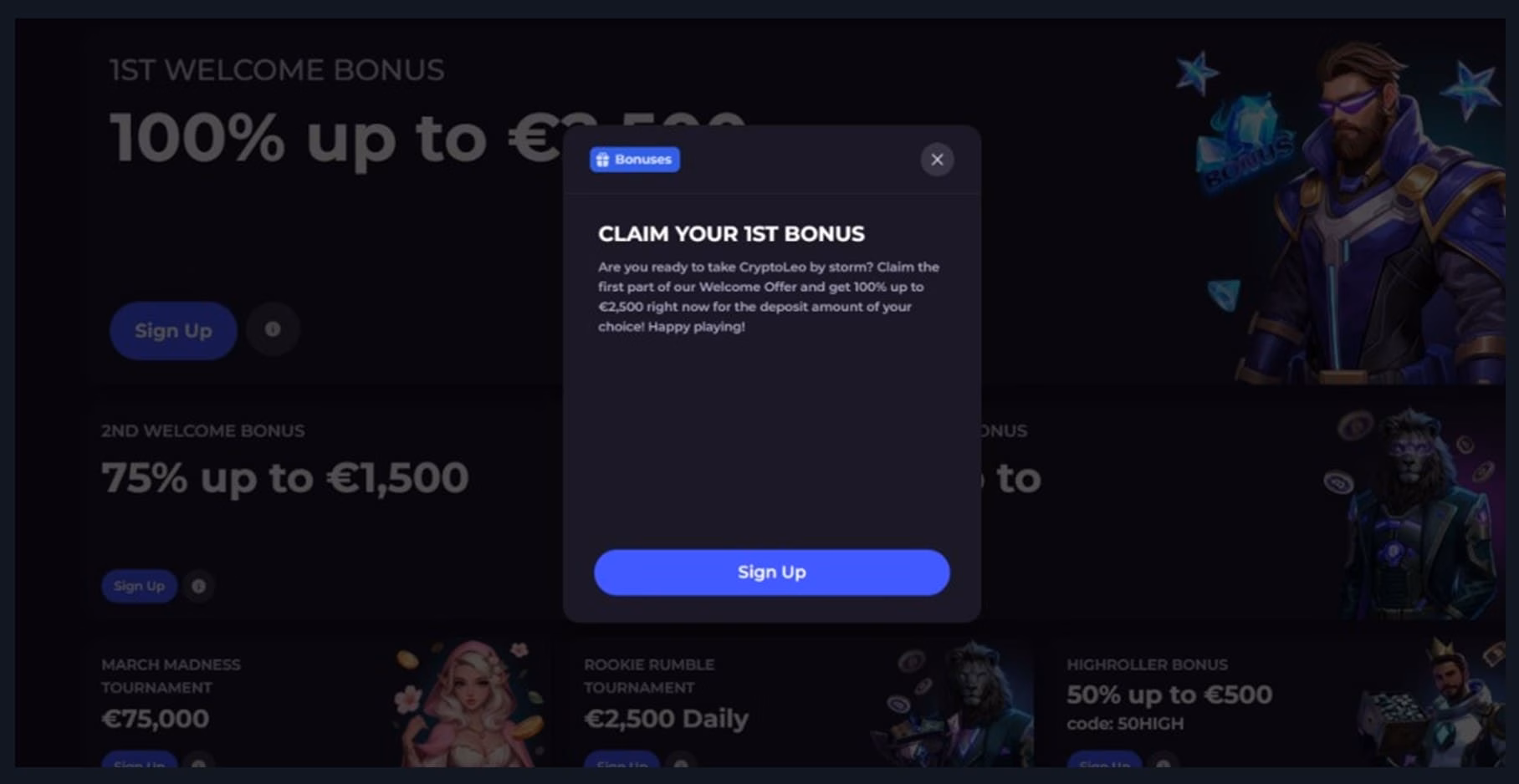 CryptoLeo casino advertises a welcome bonus worth “100% up to €2,500” – however, even if you click on the “i” button, it provides quite literally zero information. To find the detailed welcome package terms and conditions, you’ll need to click the link in the site footer. Here’s a quick overview of the main points: