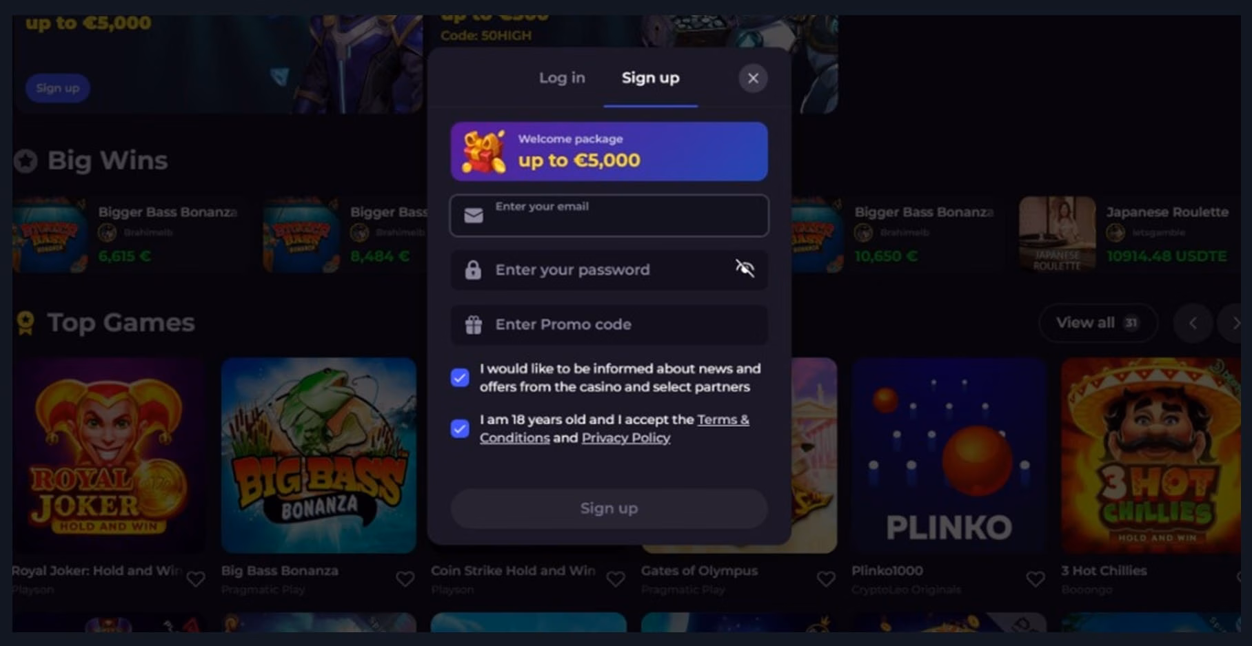 Enter your email address, choose a strong password, set your marketing preferences, and click “Sign Up”. Set your marketing preferences, then confirm you’re aged 18 and accept the Terms & Conditions and Privacy Policy.