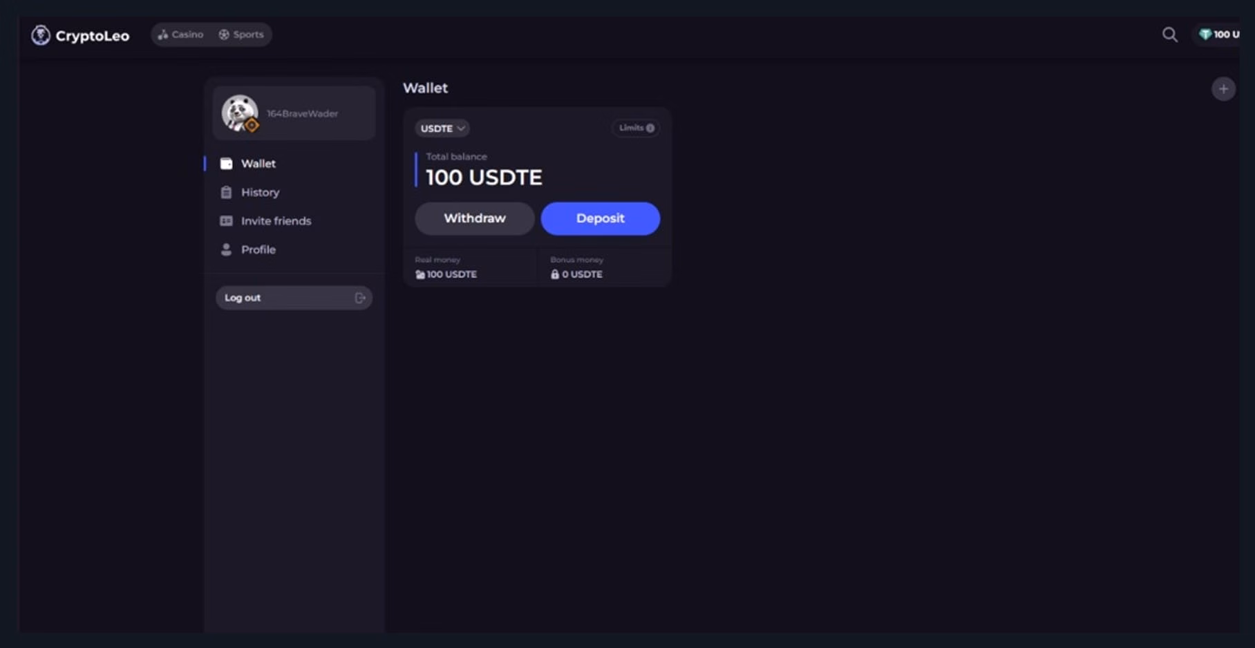 To make a crypto deposit, navigate to “Wallet” (click the Panda icon), then select “Deposit”. Choose your desired crypto from the dropdown menu, and you’ll be provided with a deposit address in the form of an alphanumeric string and a QR code.