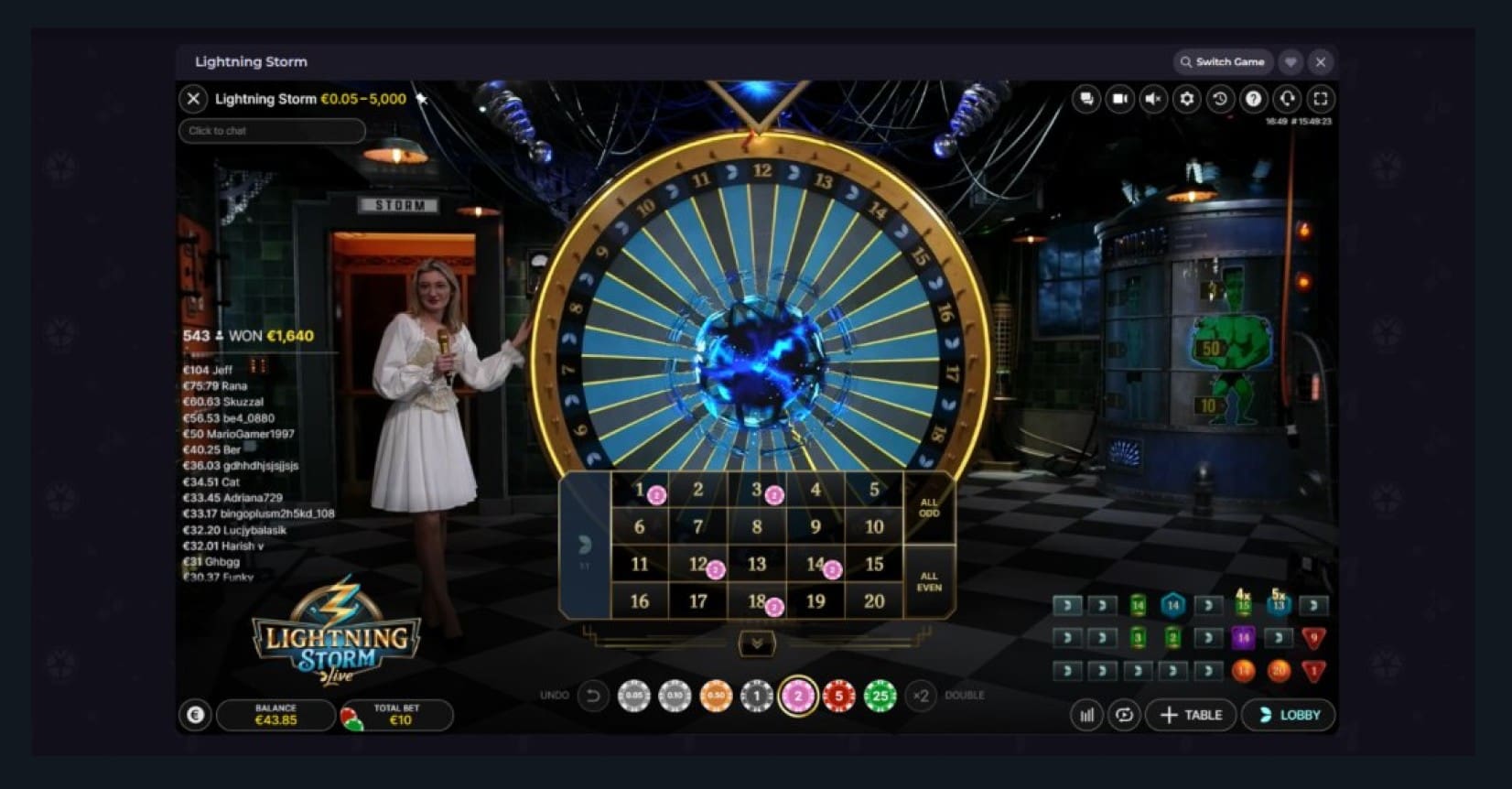The basic format will be familiar to any Evolution fan, with a main game wheel and a bunch of bonus games. The set is themed like a mad scientist’s laboratory – though, as you’d expect from Evolution, it was occupied by a rather lovely blonde host.