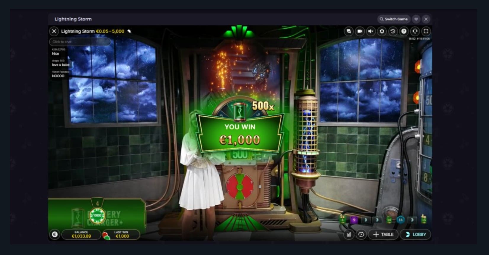 So, what happened when I tried my luck with the blonde in the lab? Well, to say I only placed 6 bets totaling 41.11 USDTE and won 1,092.72 USDTE – I’d say it went pretty well! Most of that, 1,081.89 to be precise, was won on a single bet that triggered the Battery Charger bonus game.