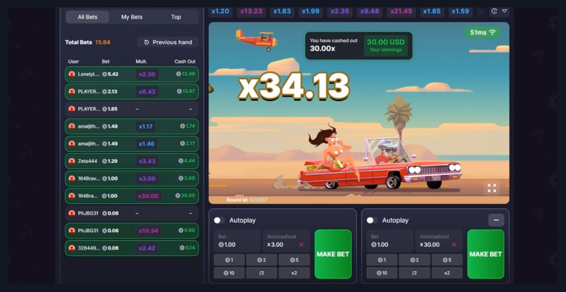 Anyway, I set myself a challenge to see how much I could make if I used the double-bet feature to play it safe and risky at the same time. Specifically, I bet $100 in total, with 50 x $1 bets set to auto cashout at a 3x multiplier, and 50 x $1 bets set to auto cashout at a 30x multiplier. I’ve used this crash strategy successfully before, but there’s no guarantee of success.
