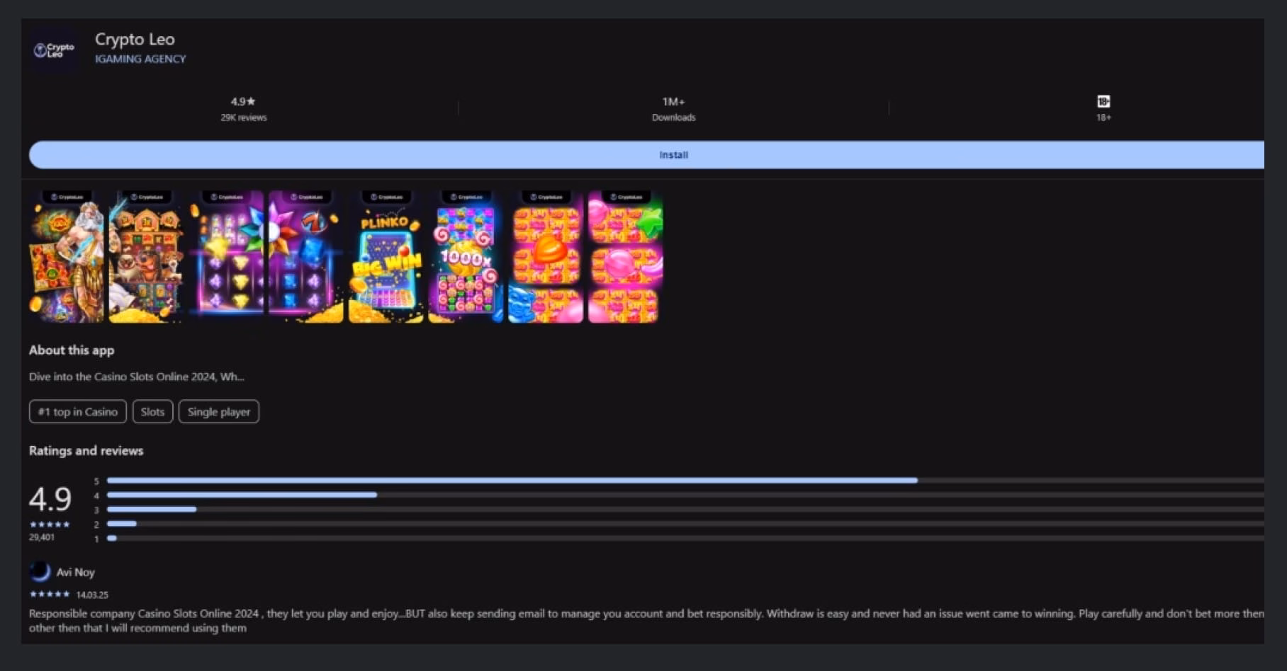 CryptoLeo provides a link to download a mobile app. However, this is extremely suspicious. For a start, it is only available directly from the site, not from any reputable app store, and the statistics provided are highly questionable. Specifically, it says the app is “#1 top in Casino”, and has “1M+ Downloads”, and a “4.9/5” rating from “29K” reviews. Yeah, right. I’m calling BS.