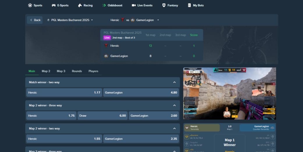 Esports betting is also available for disciplines including CS2, Dota 2, League of Legends, and Valorant.