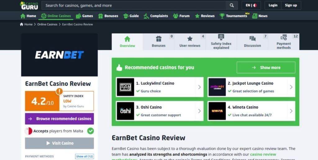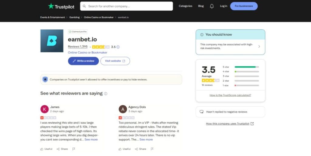 Now we’ve seen what EarnBet casino offers in terms of online gambling products, let’s check out its reputation. As always, keep in mind that platforms like Trustpilot are now overrun with fake reviews and reputation laundering campaigns, and the others listed are affiliate marketing platforms.