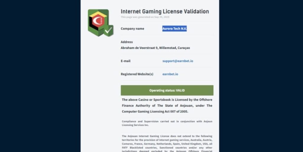 Curious how EarnBet performs on trust and fairness? Below is a breakdown of the unique factors we considered when calculating its CoinBets Safety Index. This rating is based on objective criteria including licensing, player reports, game fairness, and operational transparency. Our goal is to inform players with verified data, not to promote or recommend any casino.
