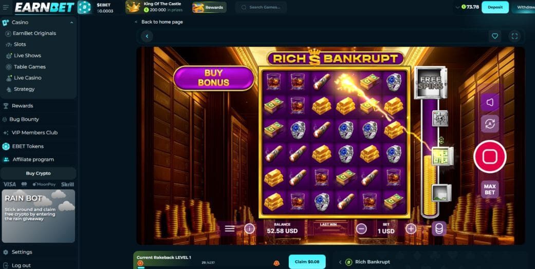 EarnBet makes quite the song and dance about its loyalty rewards. Active players can look forward to rakeback of up to 62.5%, surprise crypto drops courtesy of the Rain Bot, and a weekly loss rebate (20% if losses are under $50K, and 30% if they are over $50K).