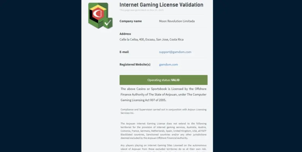 Gamdom is operated by Moon Revolution Limitada, a company registered in Costa Rica (company no. 3-102-903008). It is licensed in Anjouan (license number ALSI-152406043-FI).