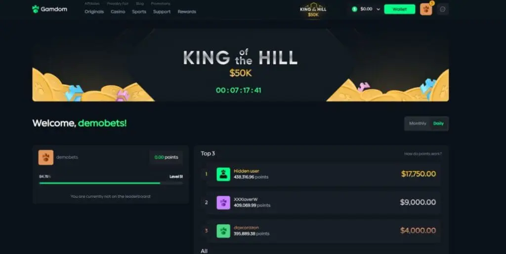 The flagship Gamdom promotion is the King of the Hill tournament. This used to feature a $10K daily and $1m monthly prize pool, but has since been upgraded to $50K and $1M respectively.