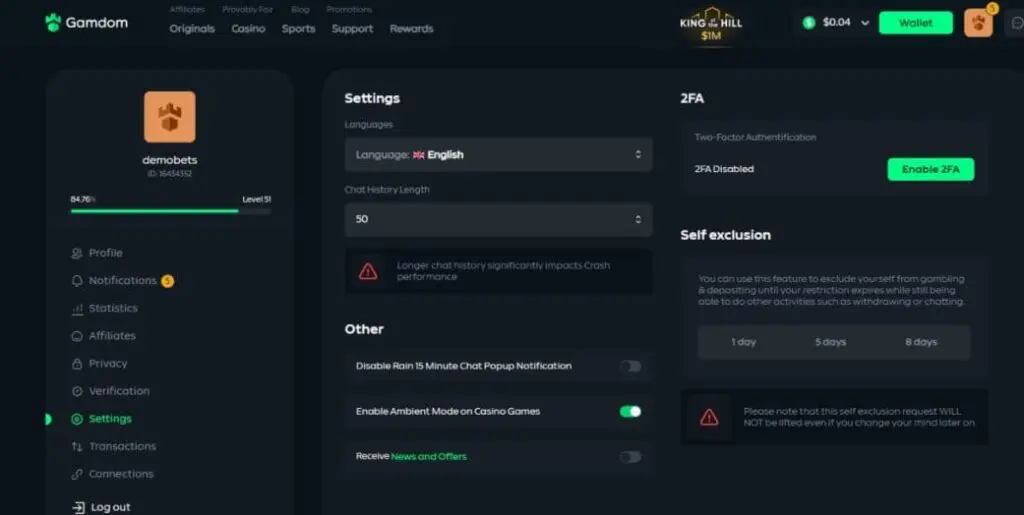 When it comes to responsible gambling, Gamdom has made some effort. You can easily self-exclude for 1, 5, or 8 days. However, that falls far short of best practice. I want to see the ability to self-exclude permanently, and set deposit, wager, loss, and time limits.