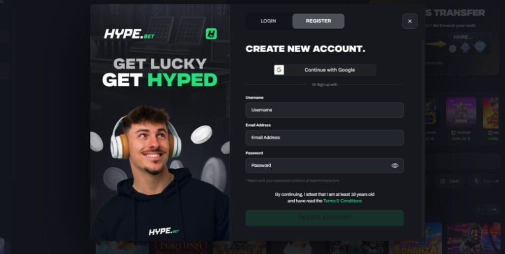 Registering a new account with Hype.bet is quick and easy, with two options available: