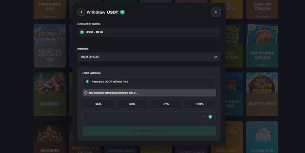 To make a crypto deposit, tape the green “Wallet” button, then select a cryptocurrency. You will be provided with your personal deposit address in both QR code and text formats. The minimum deposit amount will be clearly stated in yellow.
