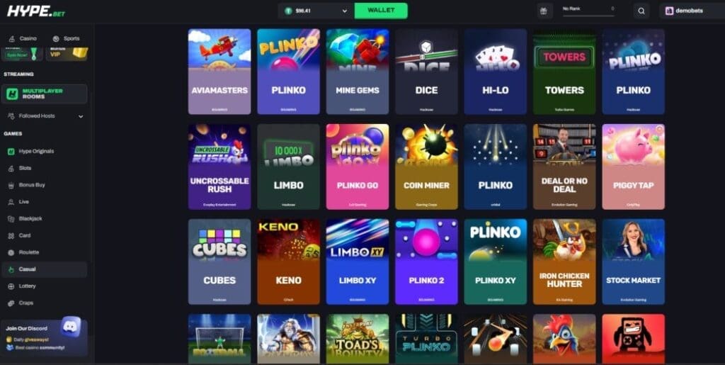 Crash games get their own dedicated category at Hype.bet, which is very convenient. And both crash and other instant wins can be found in the “Casual” games category. Nice and tidy – and with close to 300 games, quite an impressive choice. Specific titles available include Aviamasters and Plinko from BGaming, Towers from Turbo Games, Coin Miner from Gaming Corps, and Uncrossable Rush from Evoplay Entertainment.