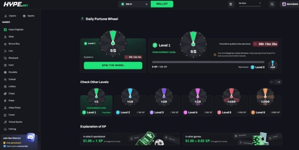 Once you’ve made your first deposit, Hype.bet will also give you a free spin of the Fortune Wheel every day. The prizes are cash, with the amount you can win depending on how many XP you have. Initially, you can win up to $5, but at Level 10 (25,000XP), you can win up to $2,500 cash.