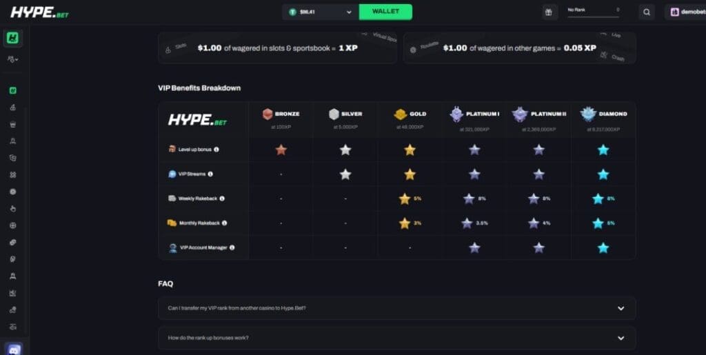 The Hype.Bet Bonus & Loyalty program features 6 tiers and offers level-up bonuses, VIP streams, weekly rakeback, monthly rakeback, and VIP account managers. You can increase your rank by earning XP points at a rate of 1 XP for every $1 wagered on slots and sports betting, and 0.05 XP for every $1 wagered in other games.