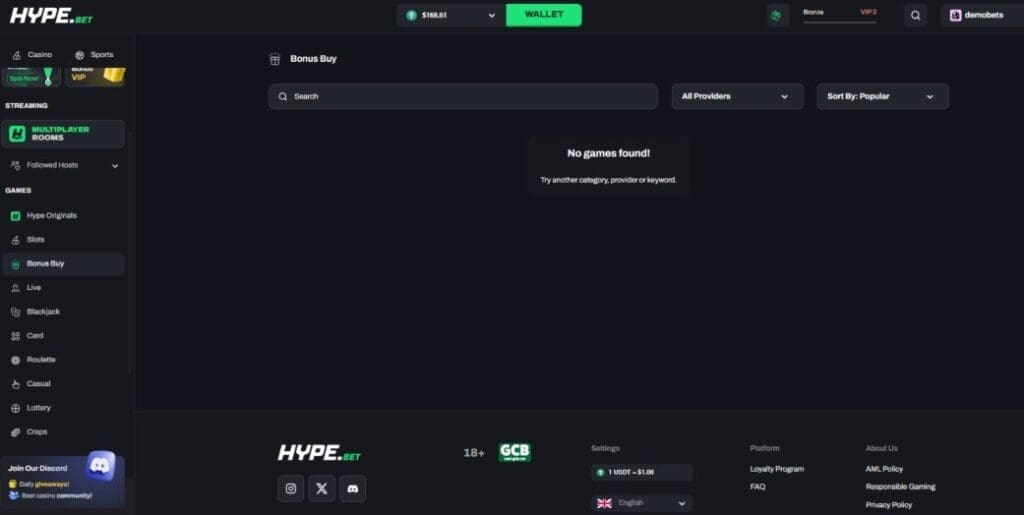 Does it have issues? Yep. First up, there are a few glitches like empty categories. Then there’s the lack of a welcome bonus, and the fact that regular promotions are thin on the ground. Also, despite very much being a product of the Web3 era, Hype.bet doesn’t really have any Web3 or crypto-first features. No native token, no NFTs, no DeFi options… just crypto payments and a few provably fair games.