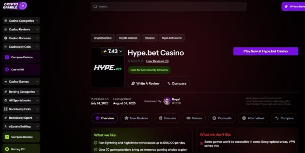 Launched in 2025, Hype.bet casino is one of the freshest faces in the crypto gambling scene – and it’s making quite an impression (but is it a good one?). The casino already offers thousands of slots, casual, table, and live dealer games, plus sports and esports betting, along with novel features like multiplayer slots.